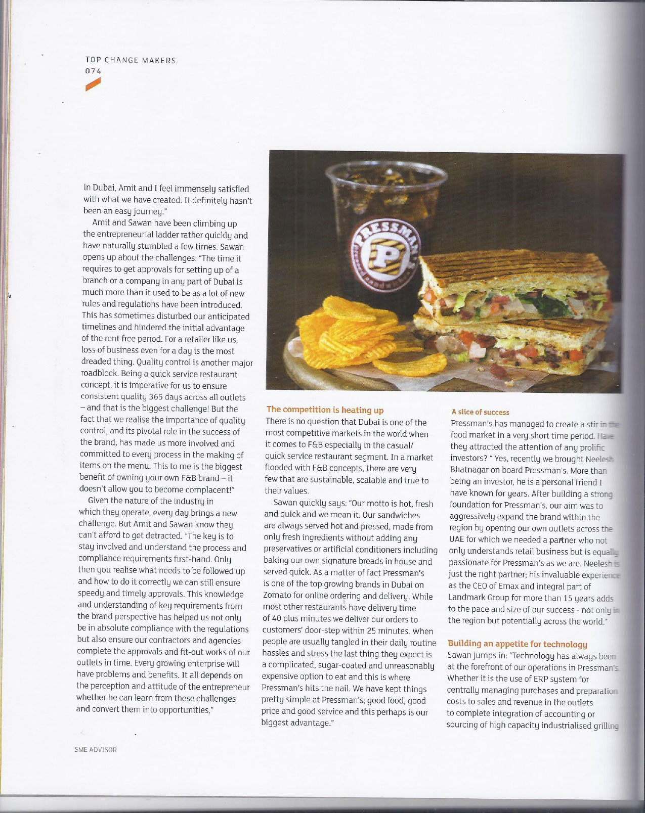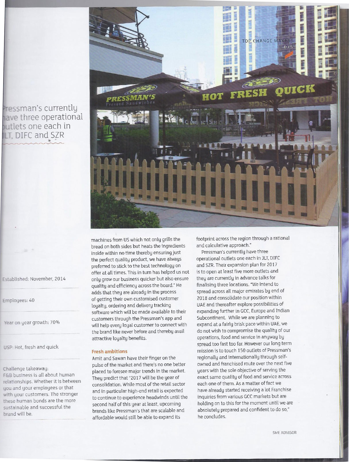 The duo has aggressive expansion plans to tap the ever growing QSR market across the globe. The founders strongly believe that although the region’s F&B market is flooded with options, quality and simplicity is rarely visible. It is with this conviction that Pressman’s is conceptualized and developed.
